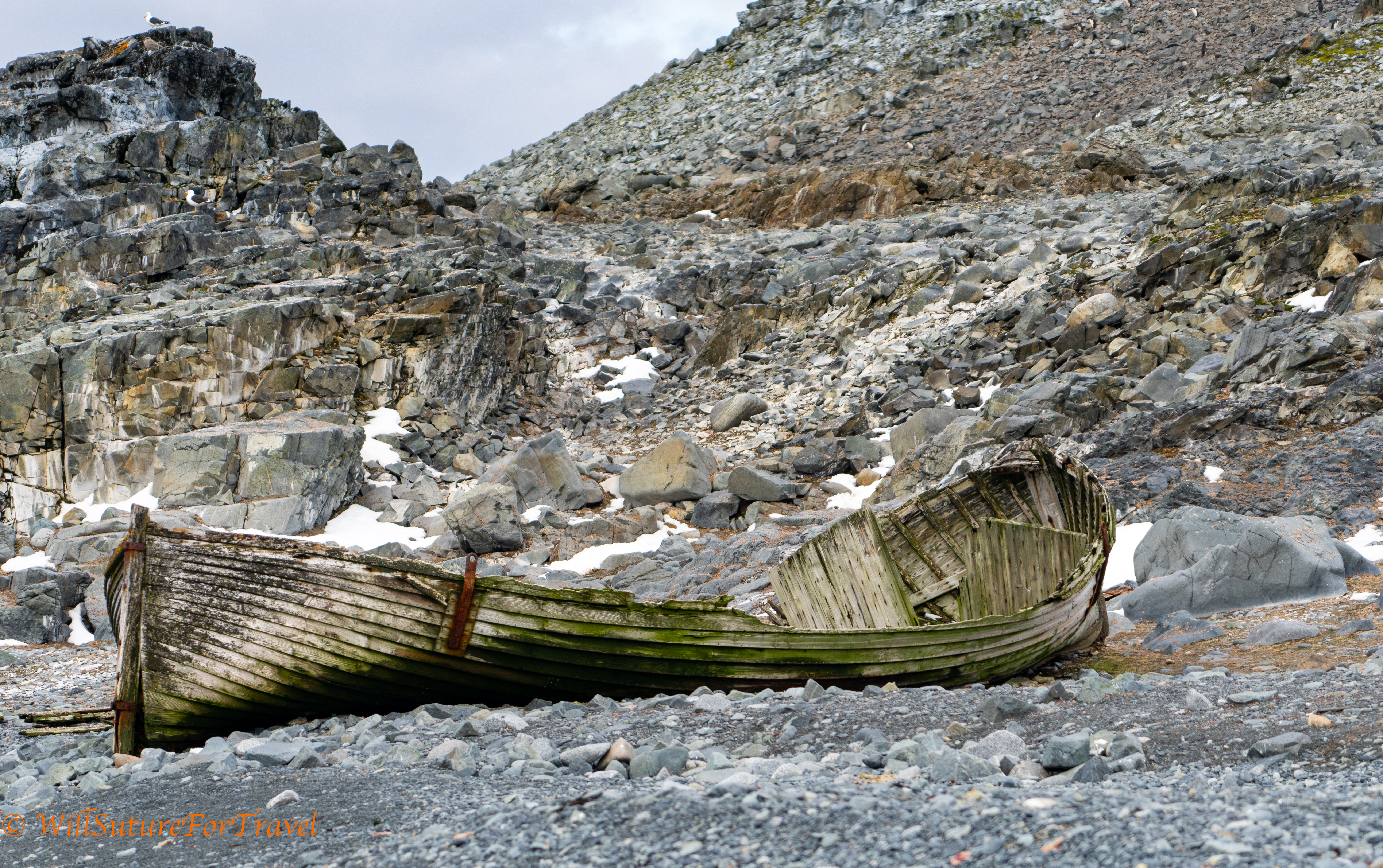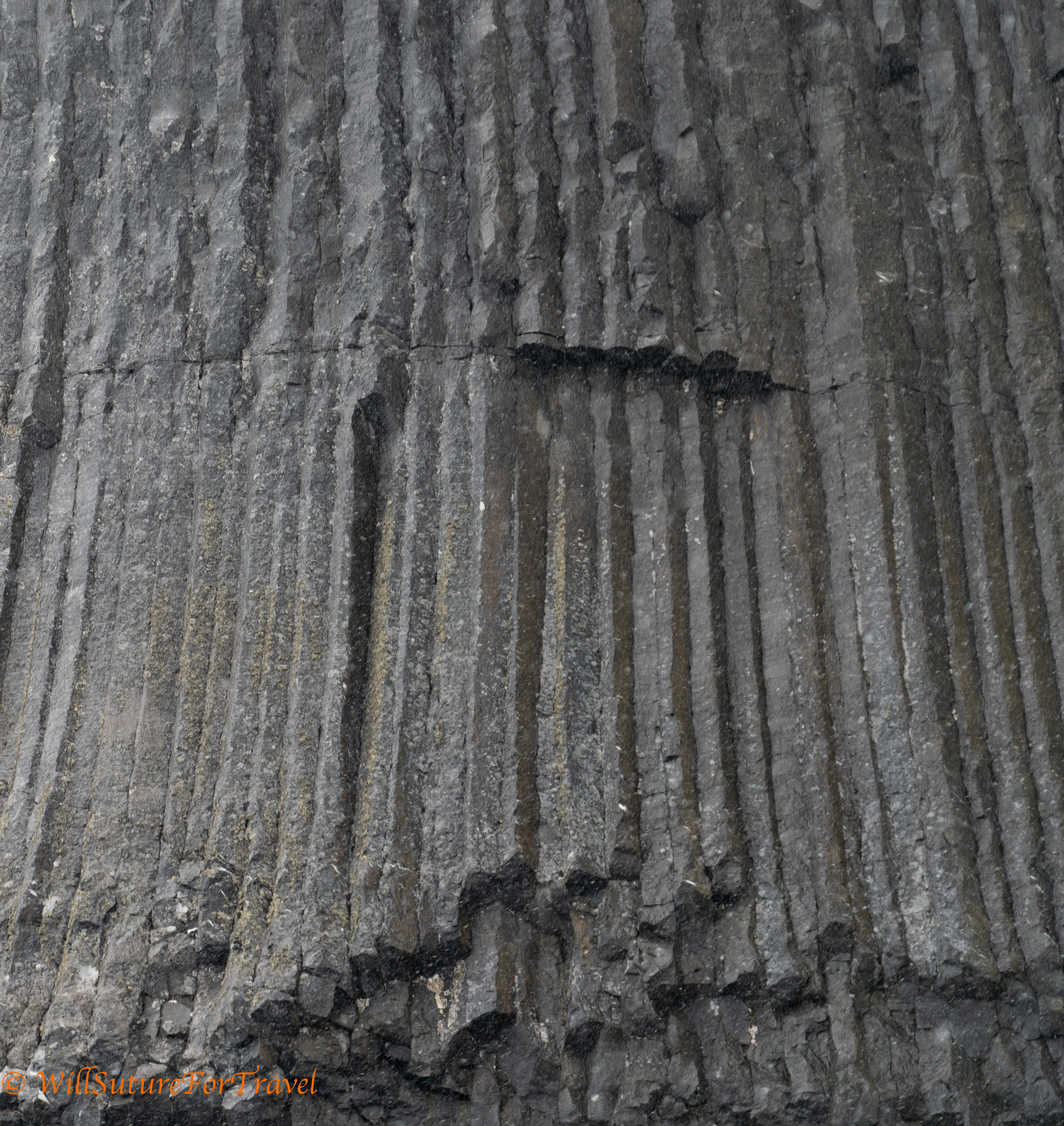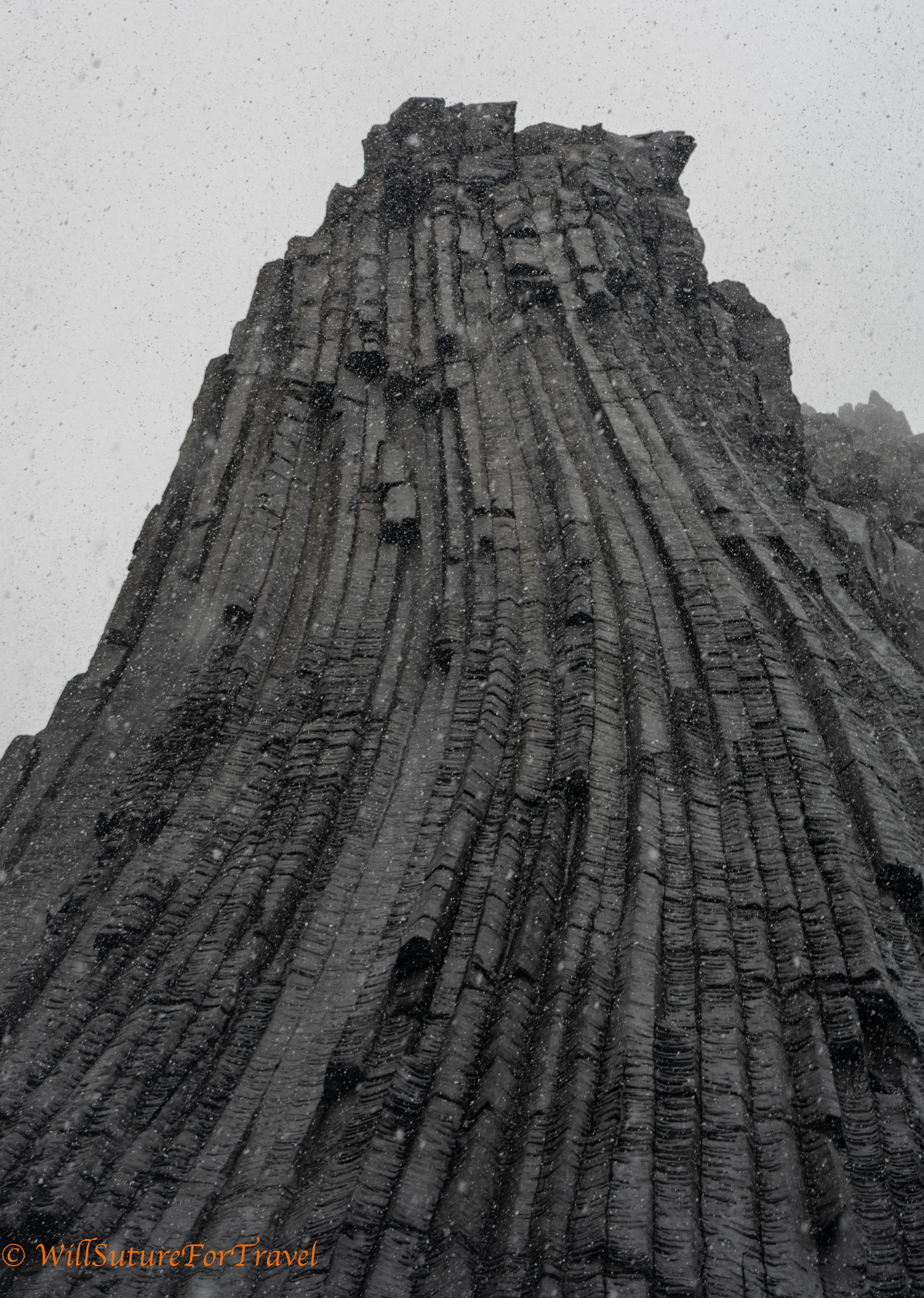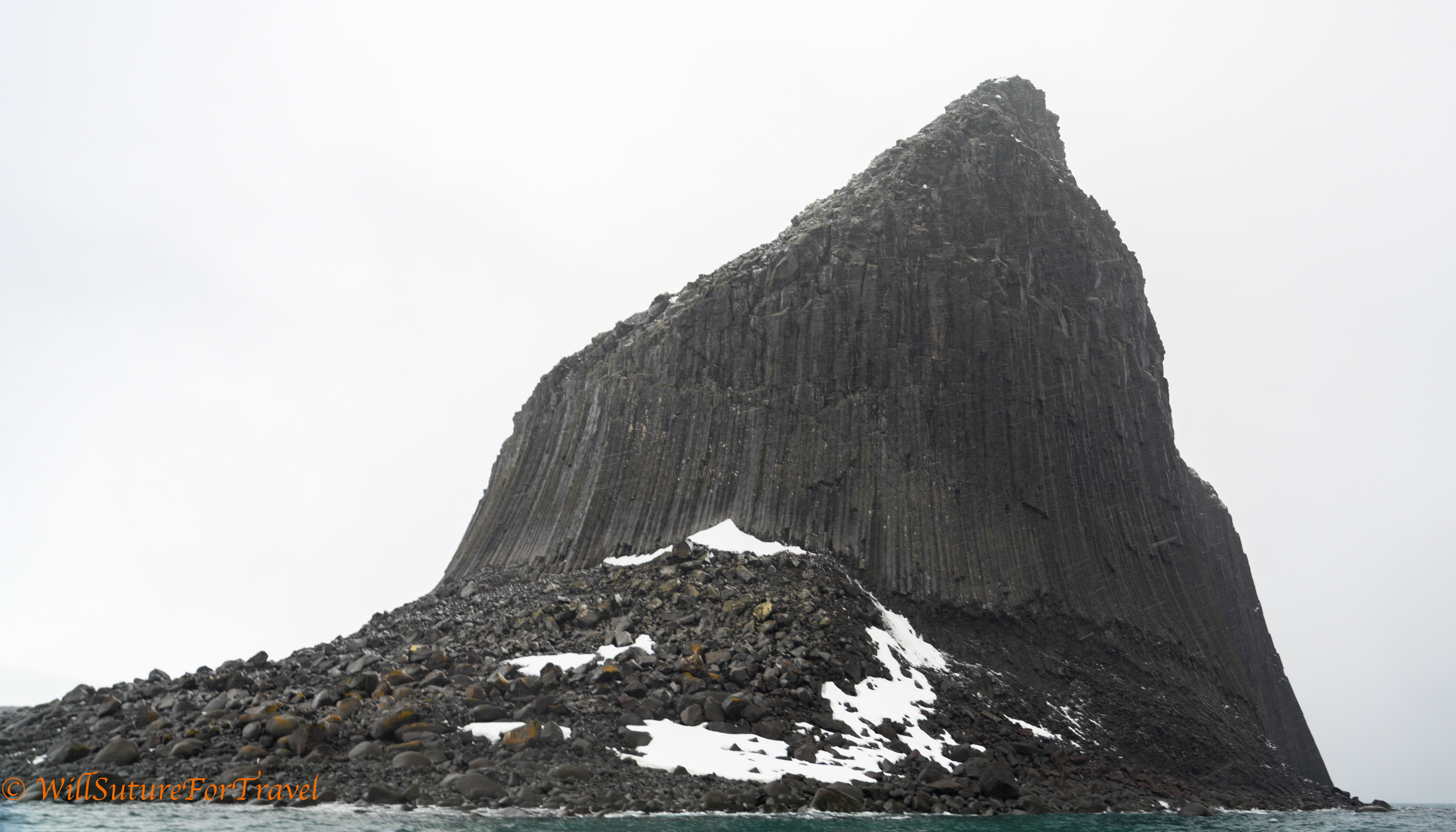 In the morning we had a zodiac excursion to a volcanic basaltic rocky mound called Edinburgh hill. This was formed when lava cooled forming hexagonal columns like Devil’s Tower or Devil’s Postpile. We were having some pretty decent snow when we were out there.