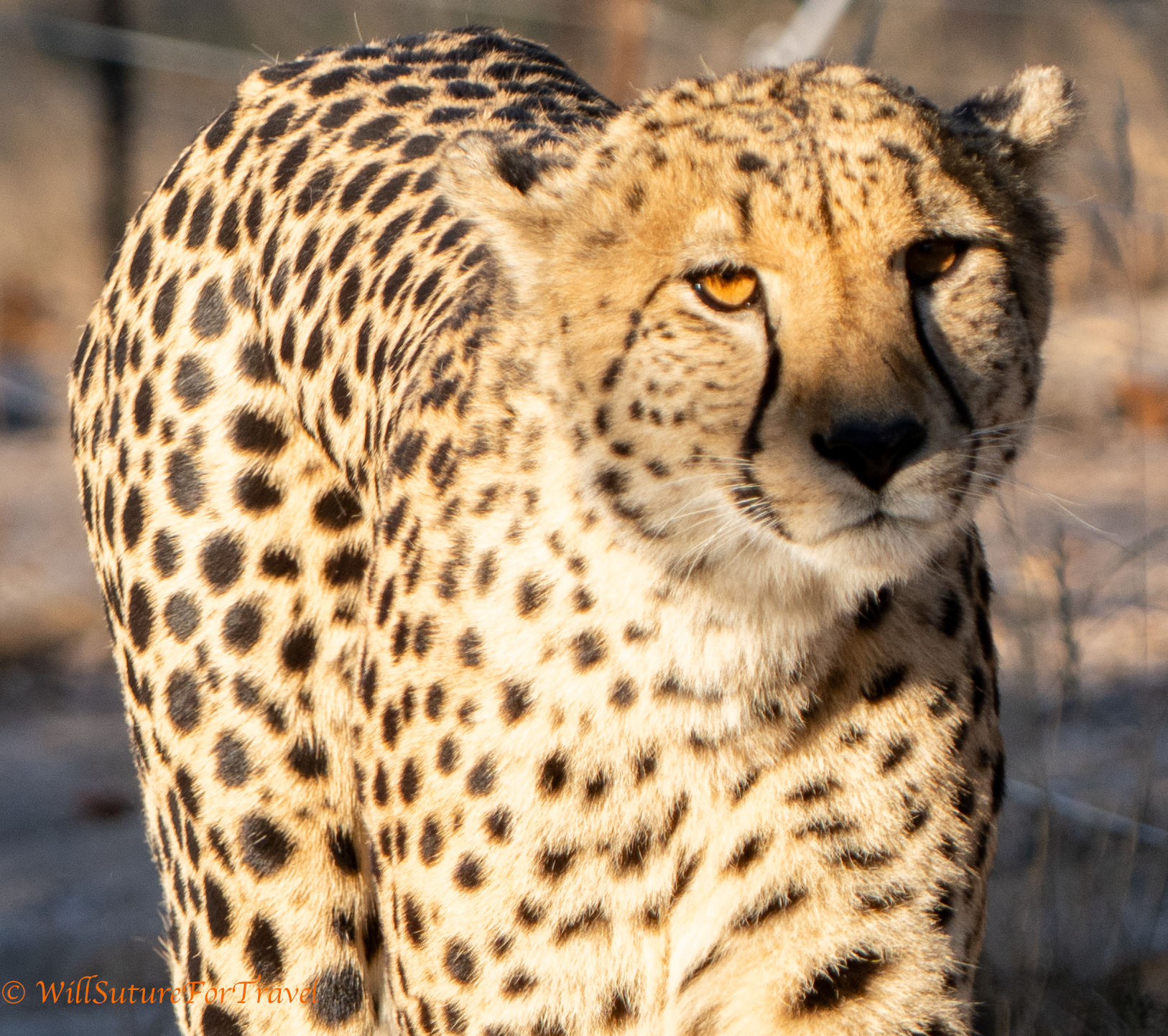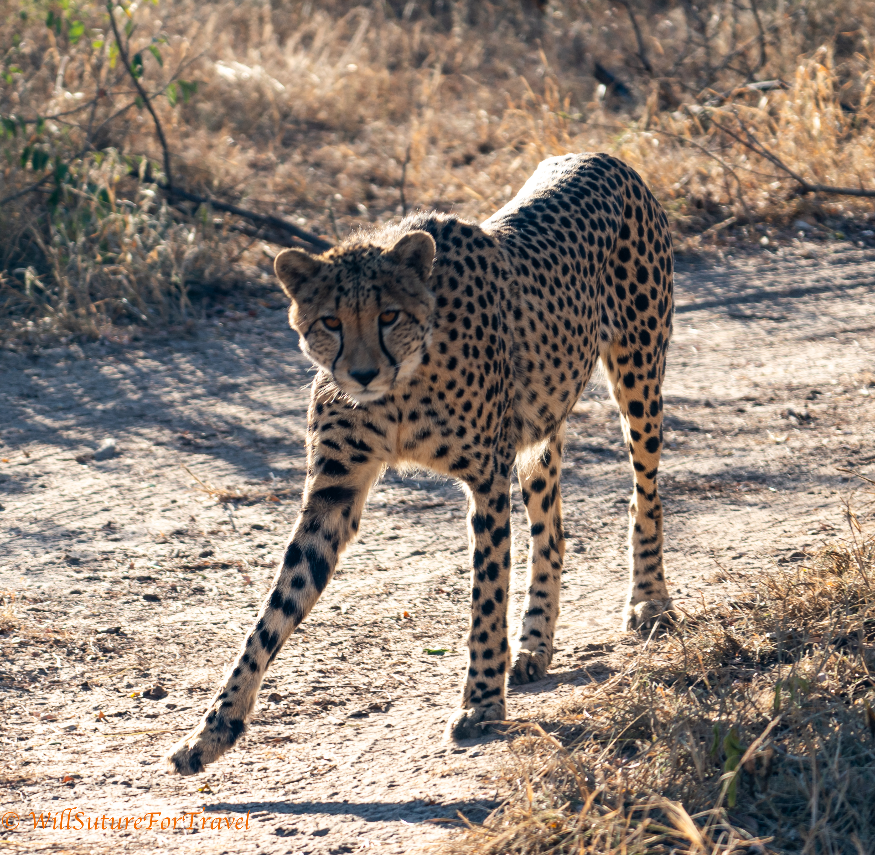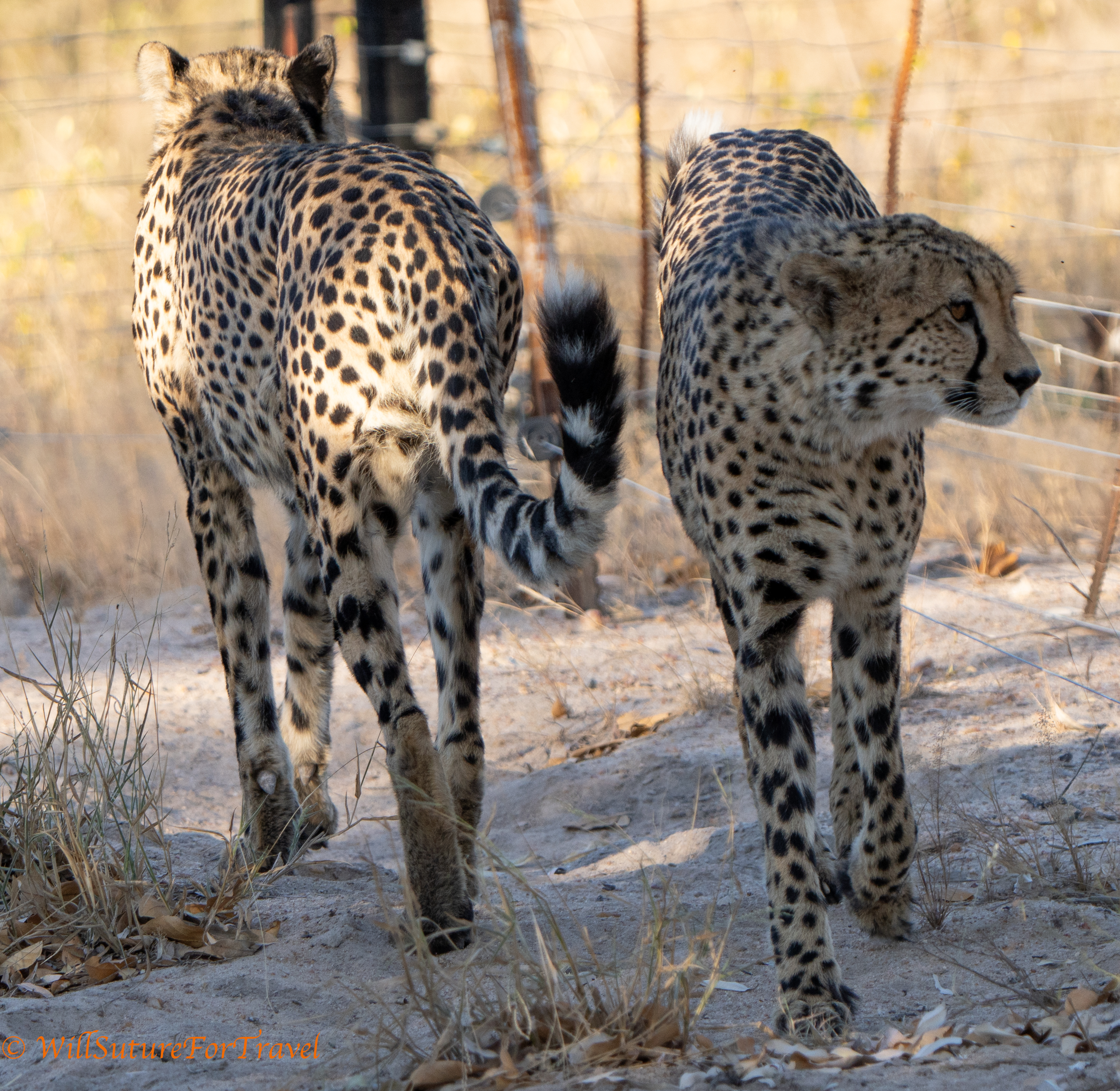 We came up on a pair of male cheetas who were just hanging out and came right by our truck. Male cheetahs, often littermates, can form coalitions which sometimes last their entire lives. Together they defend territory against other males and improve their survival chances.