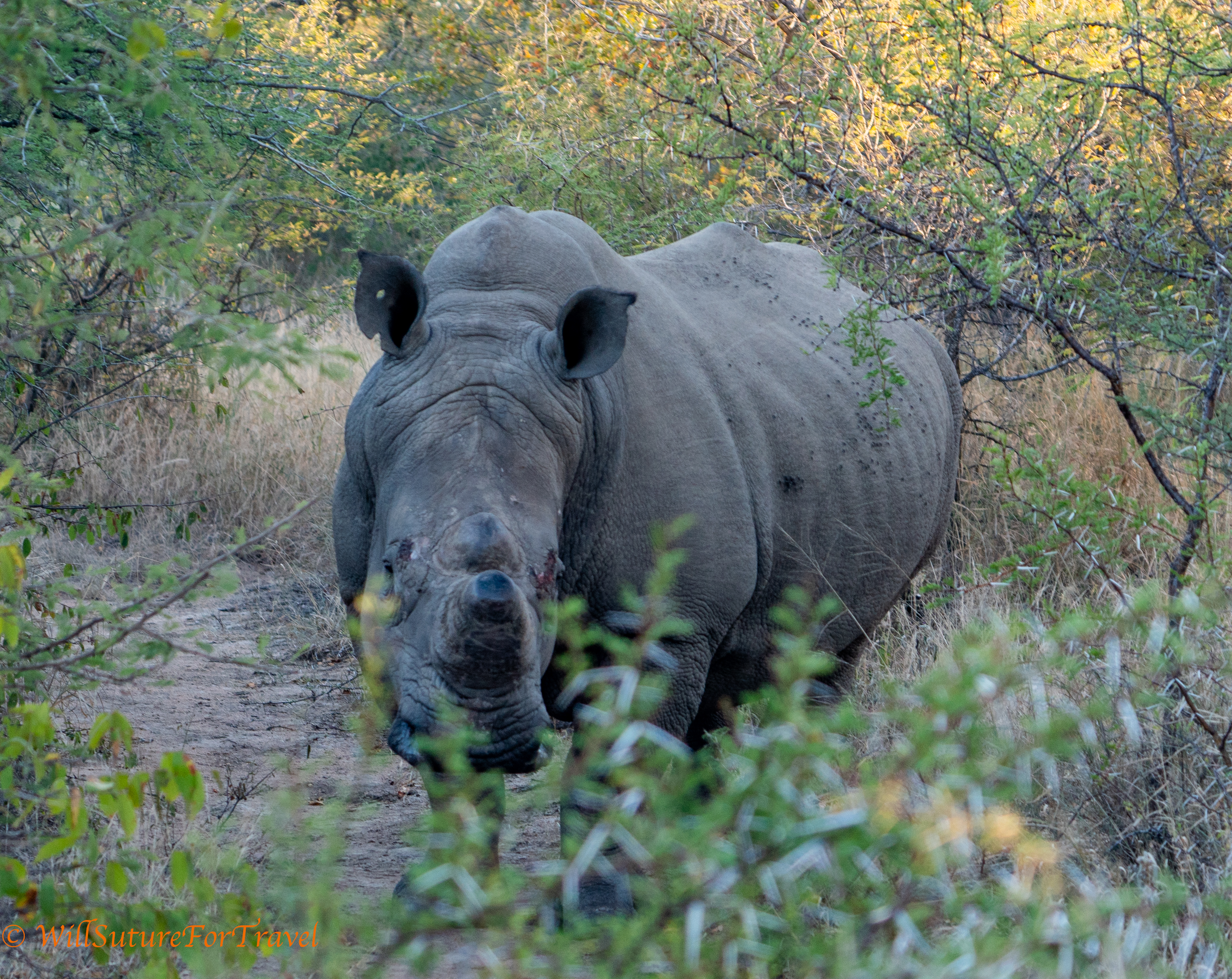 This male Southern White Rhinoceros was standing a bit in front of a group of females who were back behind some bushes. He gave me the opportunity of one photo, but then went back to the ladies. His horn has been removed to help protect him from poachers.