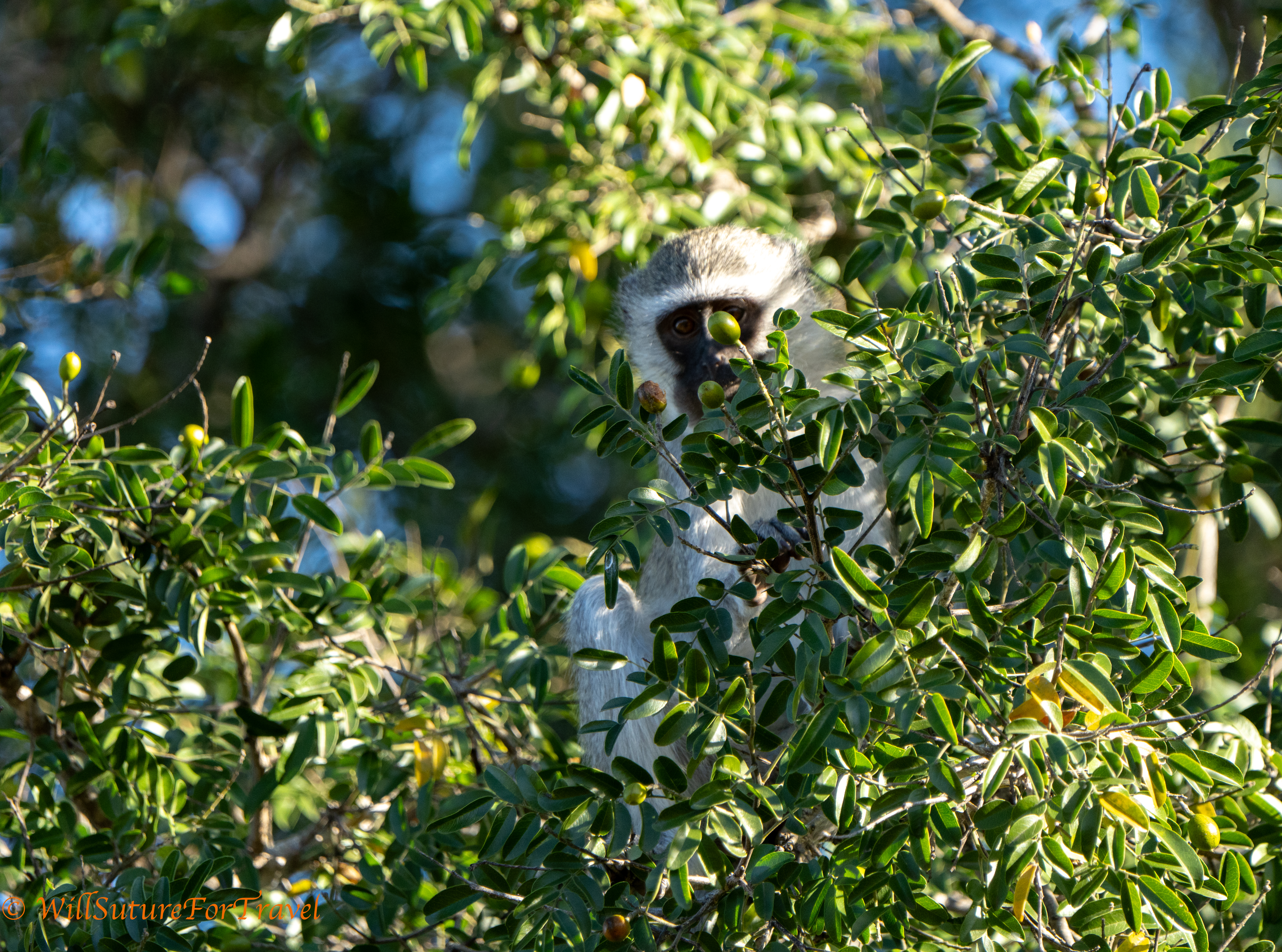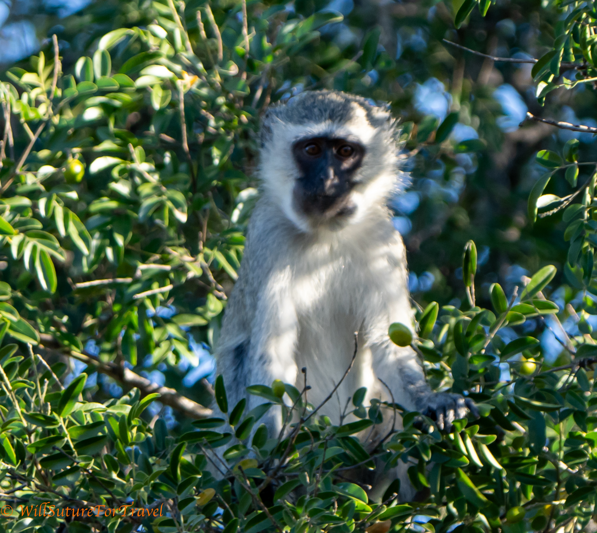 We came upon a small troop of vervet monkeys in a tree. These monkeys weigh about 9-12 lbs. They eat fruit, plants, and insects and have pouches in their mouths to store food for later.