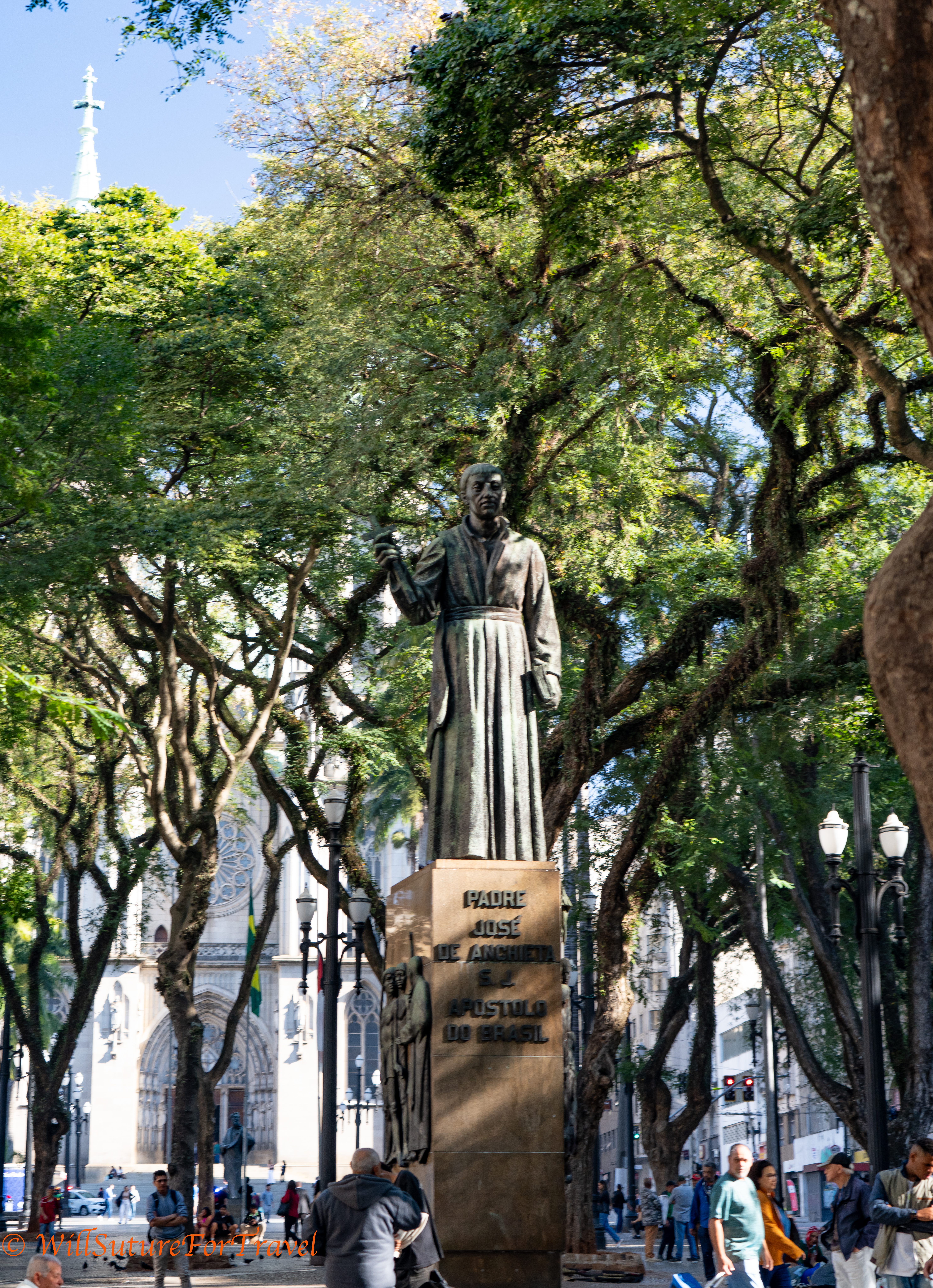 Statue in front of the Cathedral of Father José de Anchieta. He was a Jesuit missionary to the Brazilian colony in the later 16th century and helped found São Paulo.