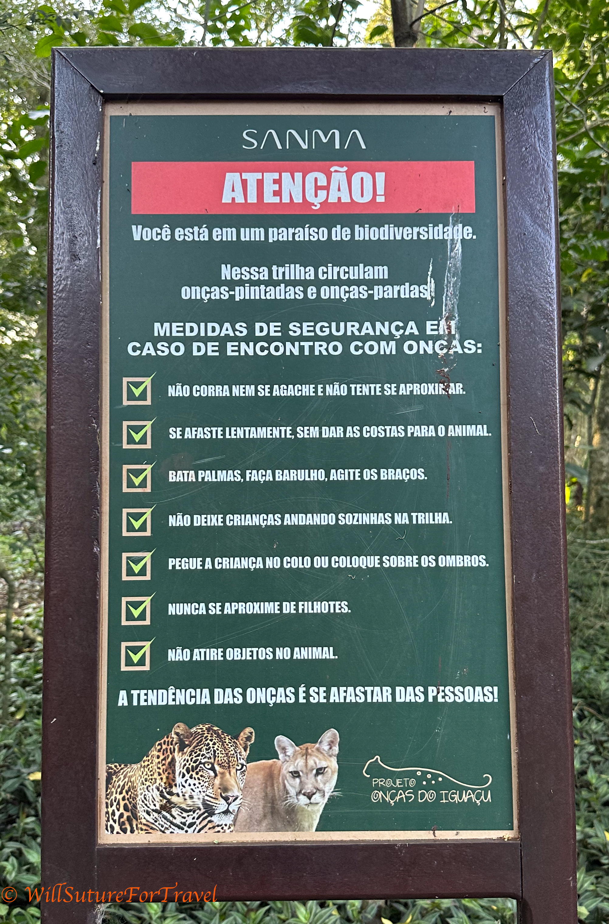 Yes, I know it’s in Portuguese. It’s basically saying that there could be jaguars and pumas on the trail and what to do or not do if you see one. We were disappointed by no trail kitties.