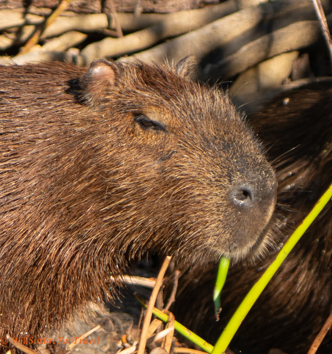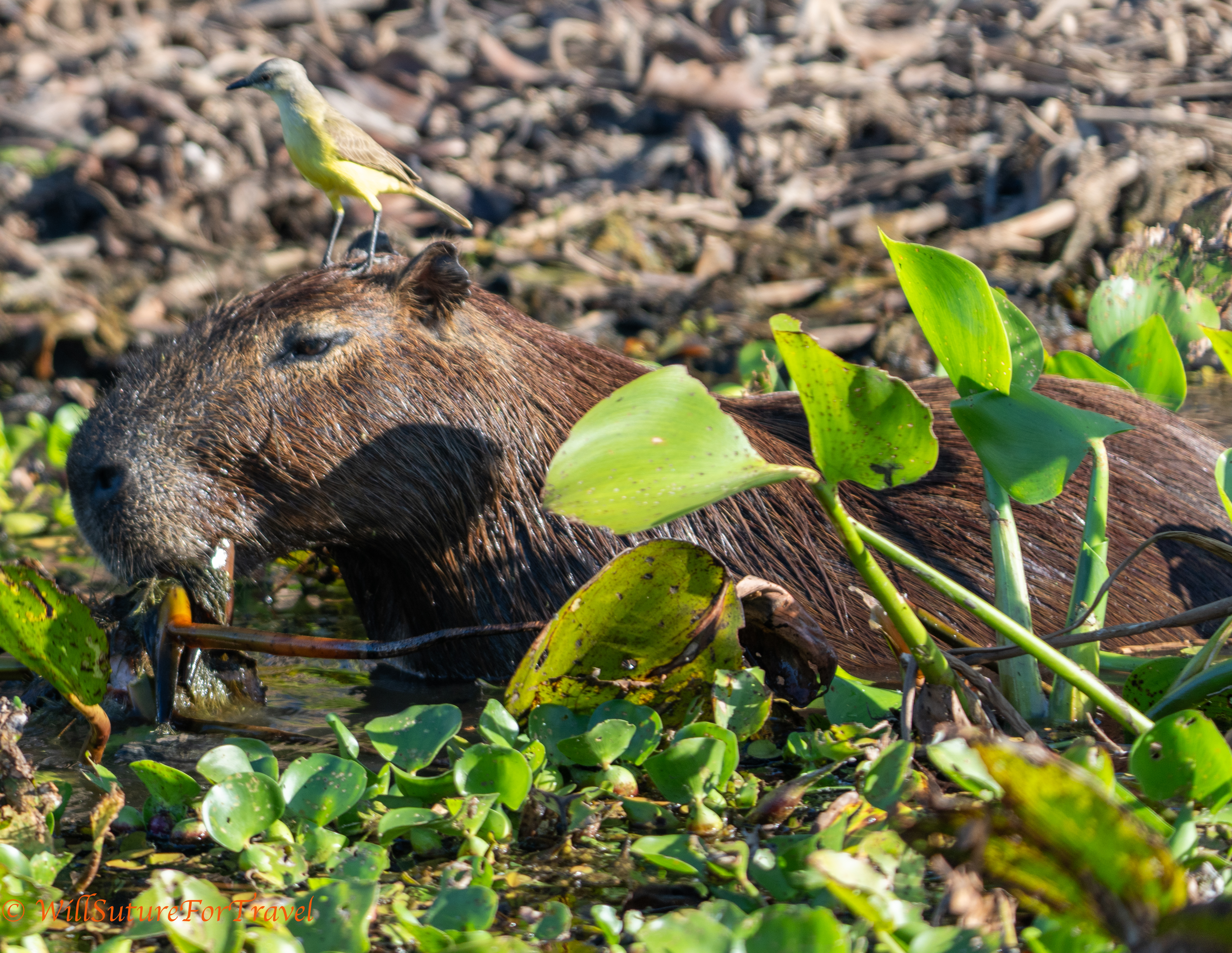 Capybara with a cattle tyrant ride-along. It didn’t seem to mind. The cattle tyrant is a flycatcher that follows or rides on grazing animals.