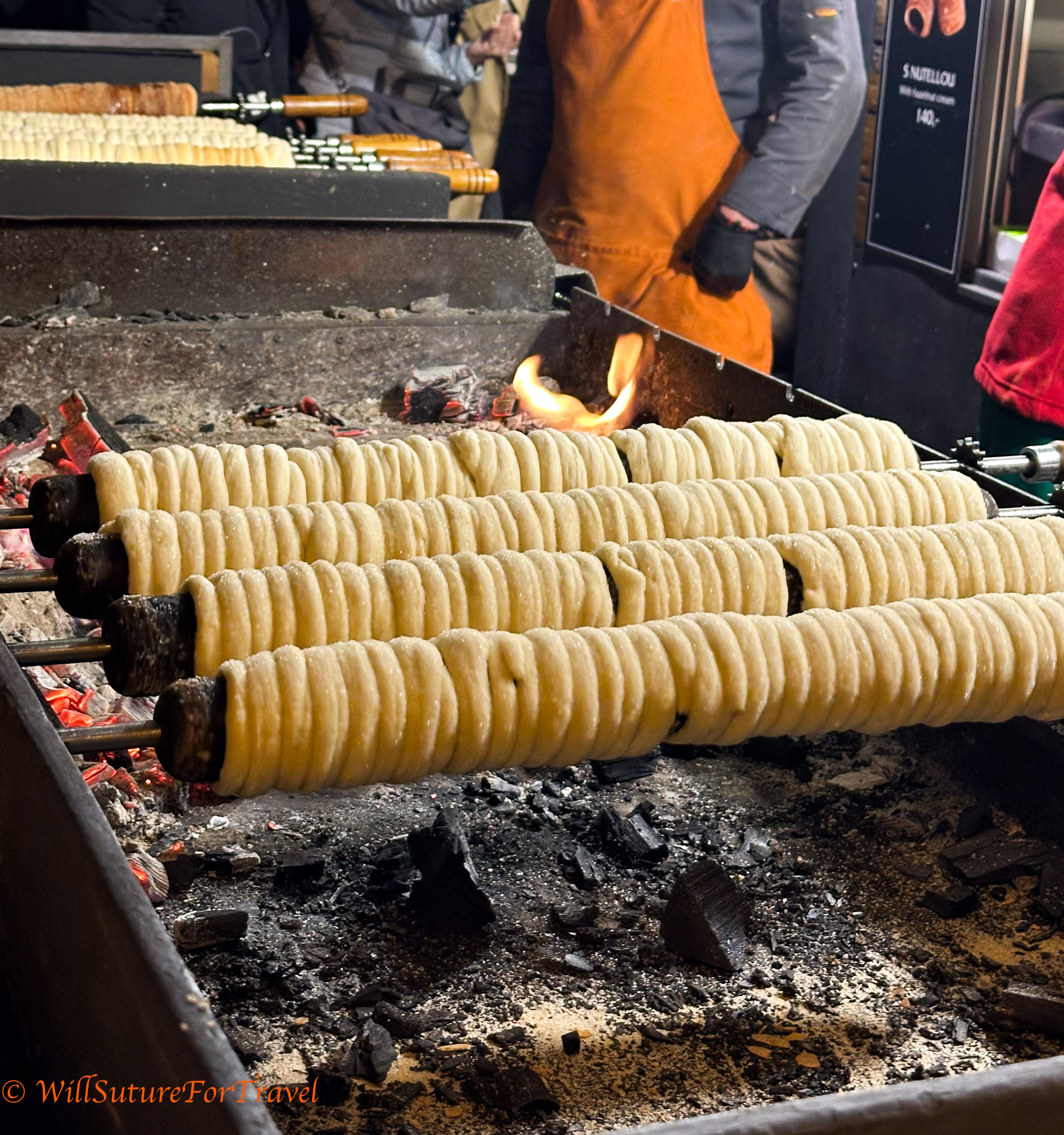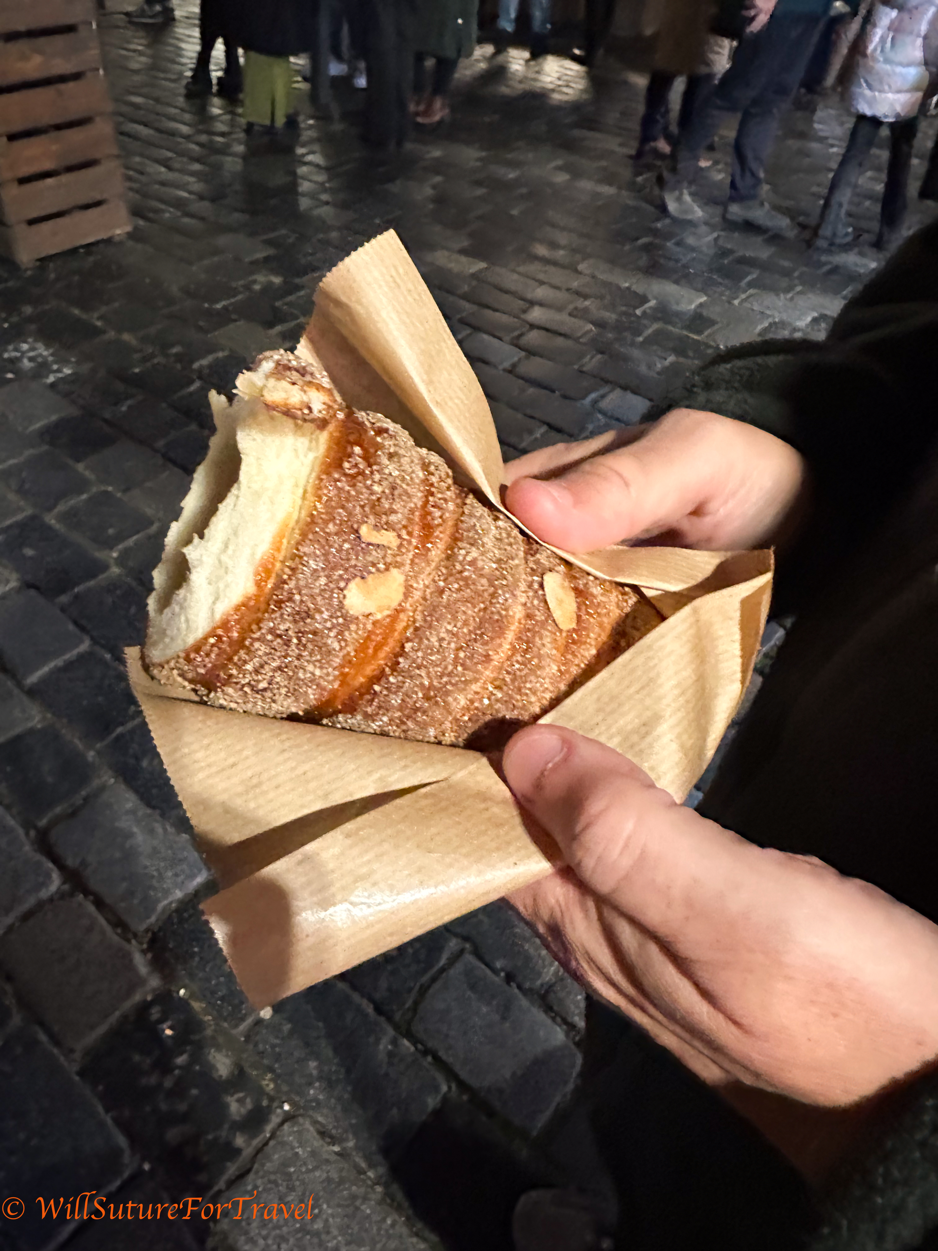 We ended the evening with a trdelník. These are originally Hungarian but are commonly sold as a street food. They are a pastry wrapped over a rod, cooked over coals, and coated in cinnamon sugar.