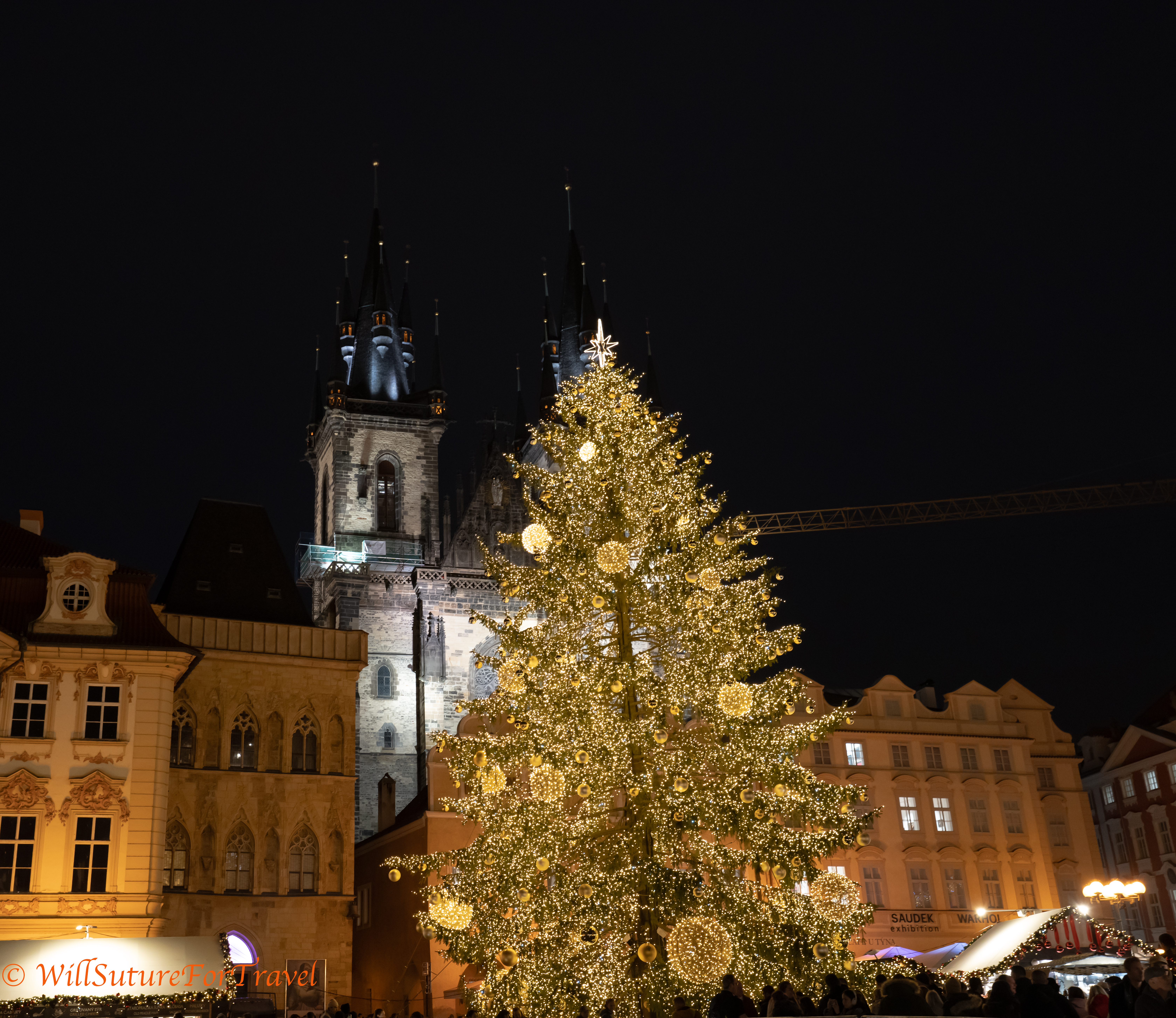They have a large Christmas tree in the center of the square. The gothic Church of Our Lady before Týn is in the background.