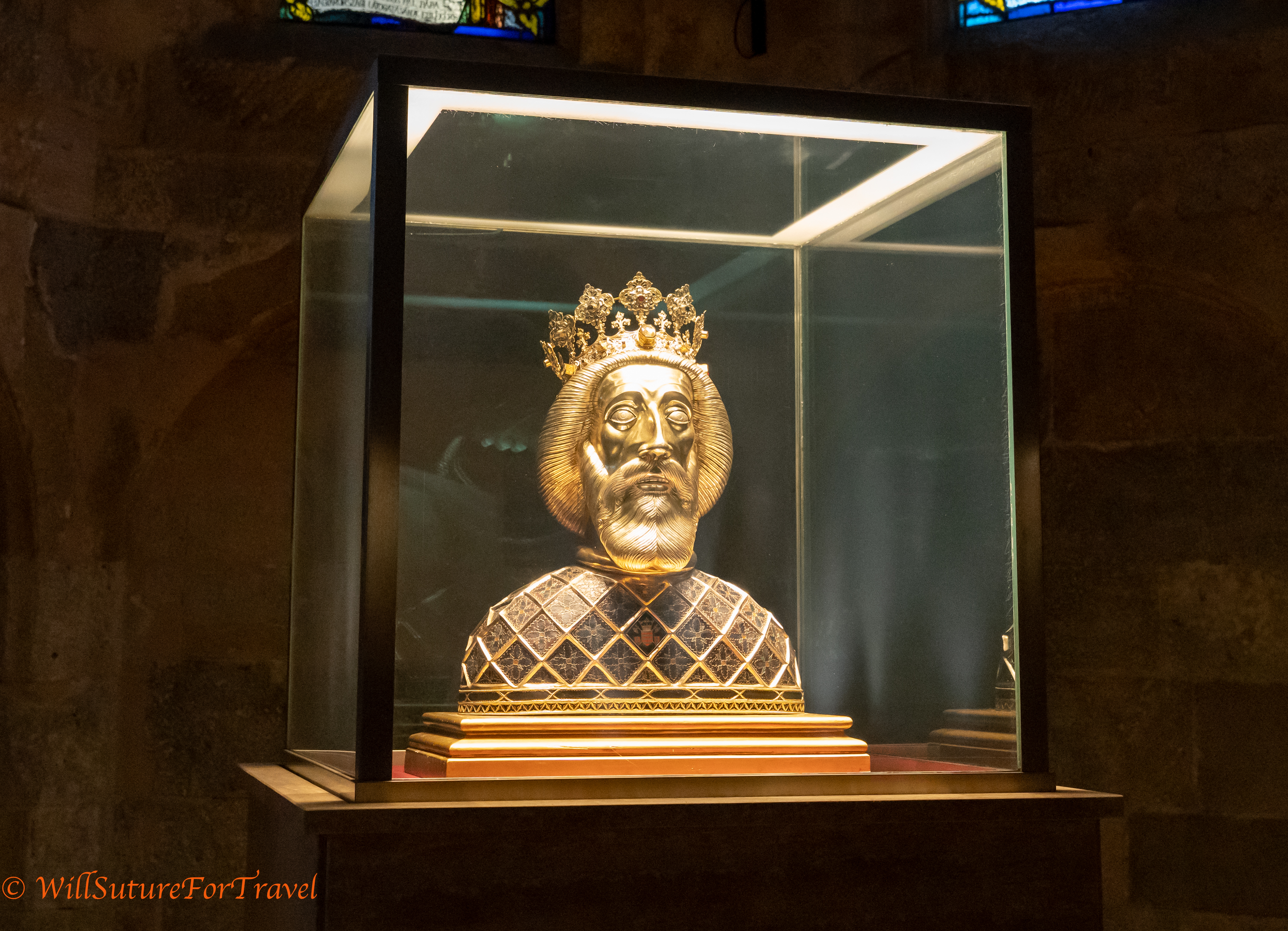 Ladisius I of Hungary ruled in the 11th century. He was canonized after death and this golden herm contains his skull.