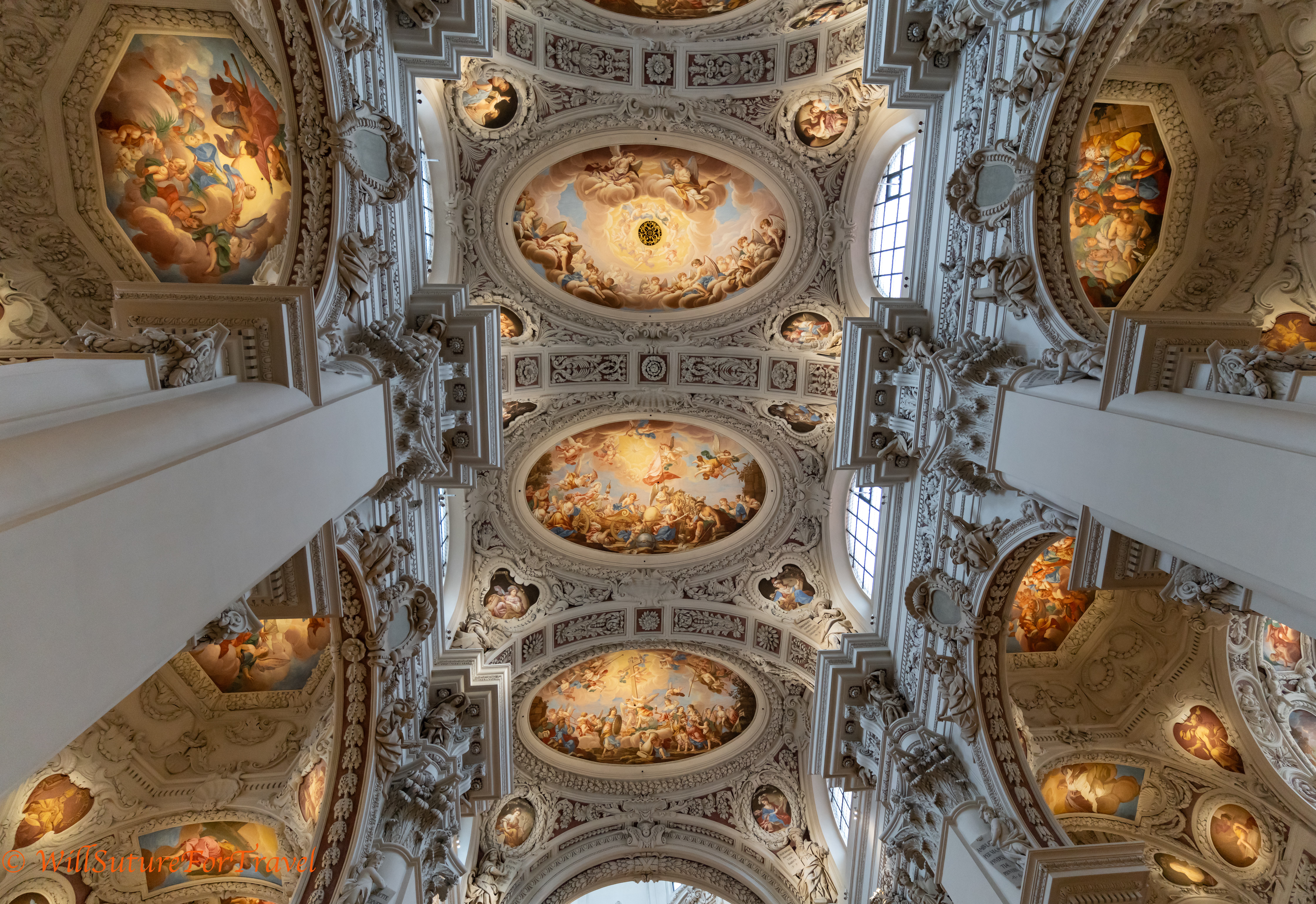 Ceiling frescoes. There is a metal grate in the middle of the top one. That is where the distant organ is.